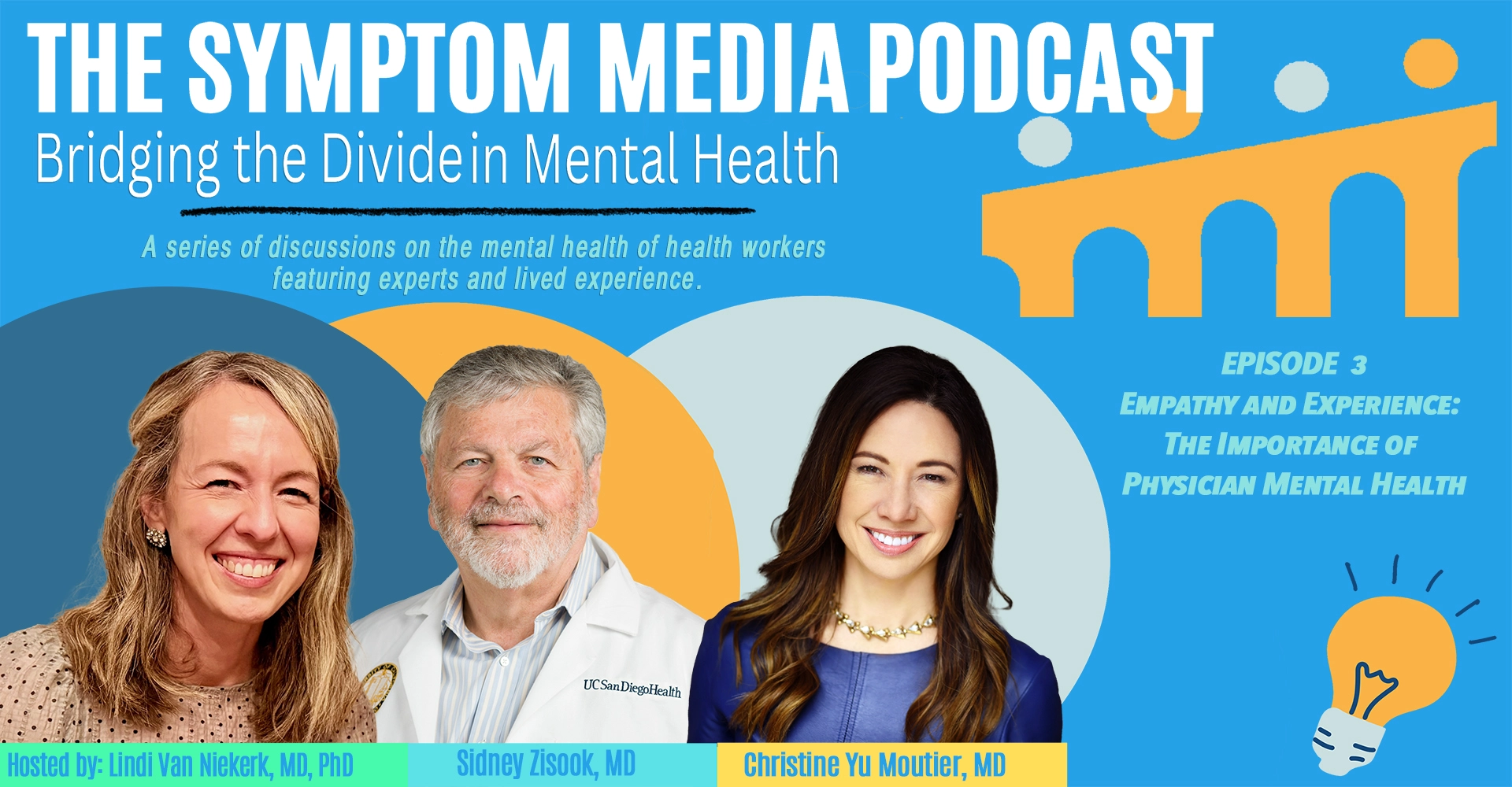 In episode 3 of The Symptom Media Podcast: Bridging the Divide in Mental Health, host Dr. Lindi van Niekerk is joined by Dr. Christine Moutier, Chief Medical Officer of the American Foundation for Suicide Prevention (AFSP) and Dr. Sidney Zisook, co-founder of UCSD’s HEAR program. Drawing from personal experience and decades of clinical expertise, Dr. Moutier and Dr. Zisook delve into the hidden burdens that many doctors carry, including eating disorders, anxiety, depression, and the pervasive stigma that prevents many from seeking help. Their candid discussion examines the historical and cultural challenges within the medical community that discourage vulnerability and perpetuate silence and how innovative programs like UCSD’s HEAR program, and the AFSP are breaking down those barriers and providing a path for others to follow.